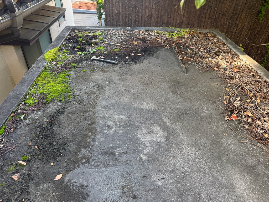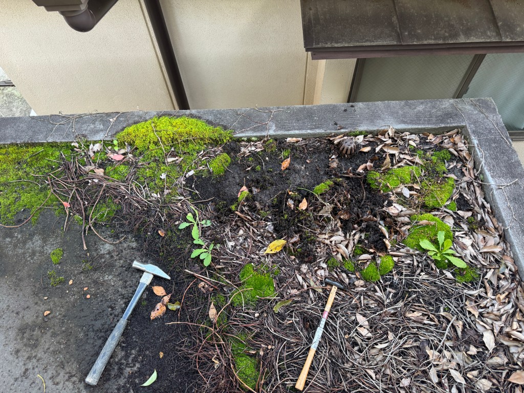 屋根の片隅に排水口を見つけました。泥や枯れ葉で、水が流れなくなっていました。水の流れが極端にわるいため、泥や枯れ葉に水分が残るため、湿気が年月をかけてコンクリートに浸透していったのでしょう。