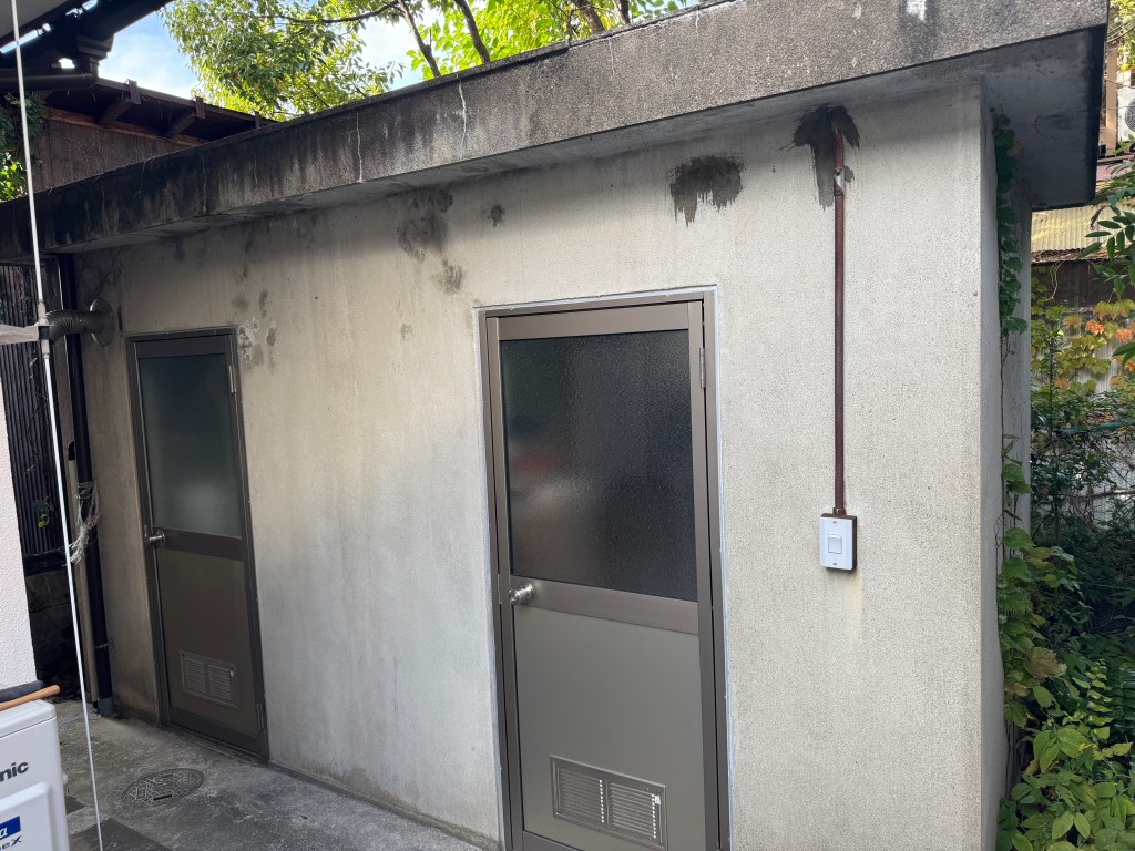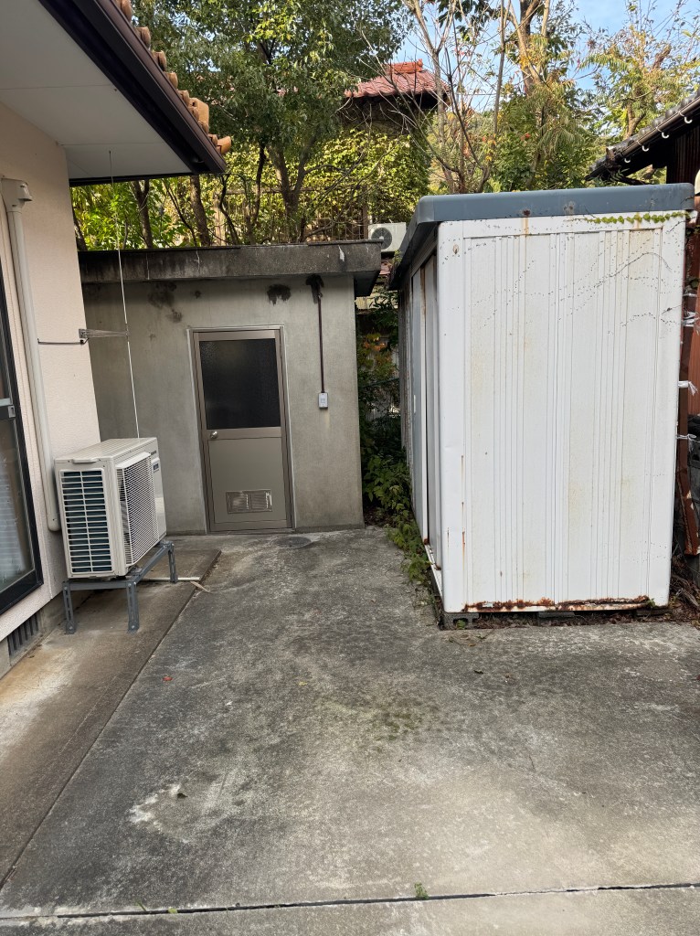 防水施工や、カバー工法でコンクリートスラブの上に屋根をつくることも提案しましたが、お客様は直すことに対してかなり不安がられていましたので、コンクリート製の物置と、その横にある鋼板製の物置を解体し、新たに物置を設置することとなりました。