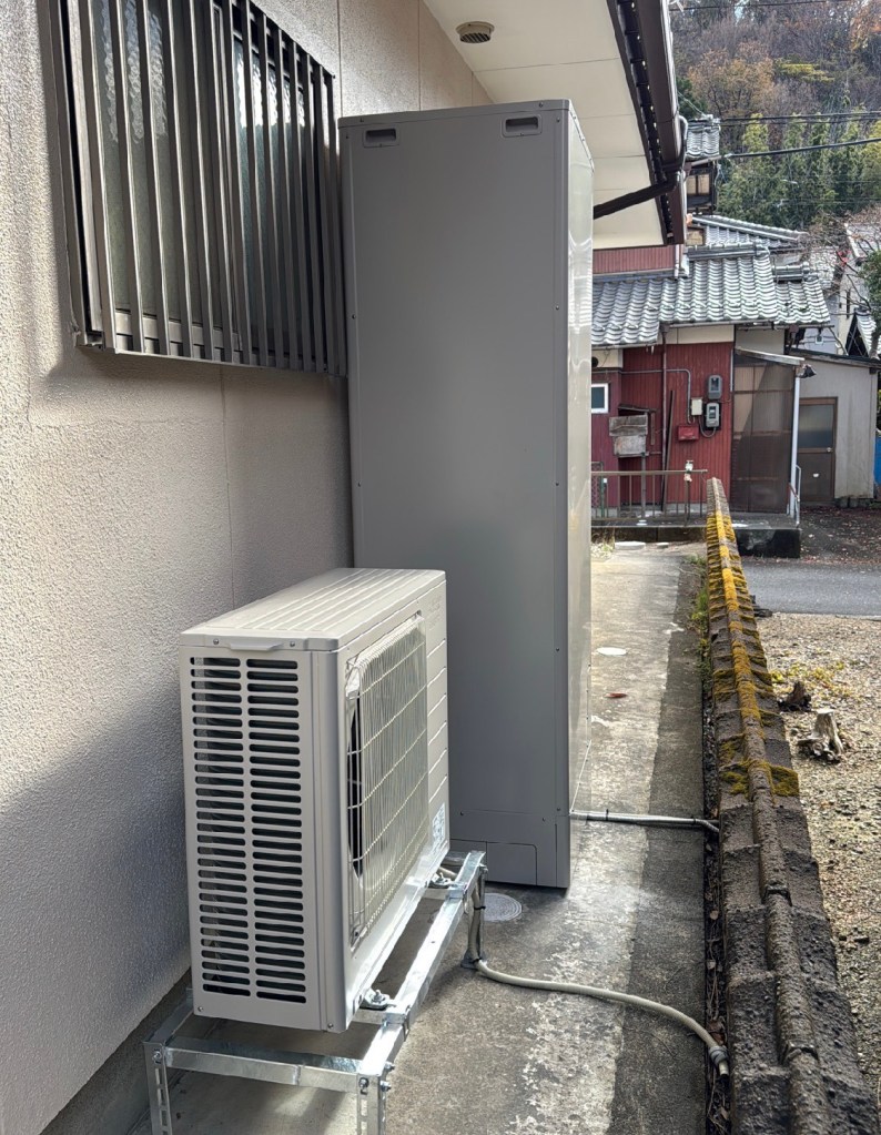 小屋を解体すると、燃焼機器の置き場に困るのと、D様もご高齢になられたため手間のかからない設備をご提案し、浴室の横にエコキュートを設置しました。「こんなことができるんですね!」と、喜んでいただけました。ありがとうございました。